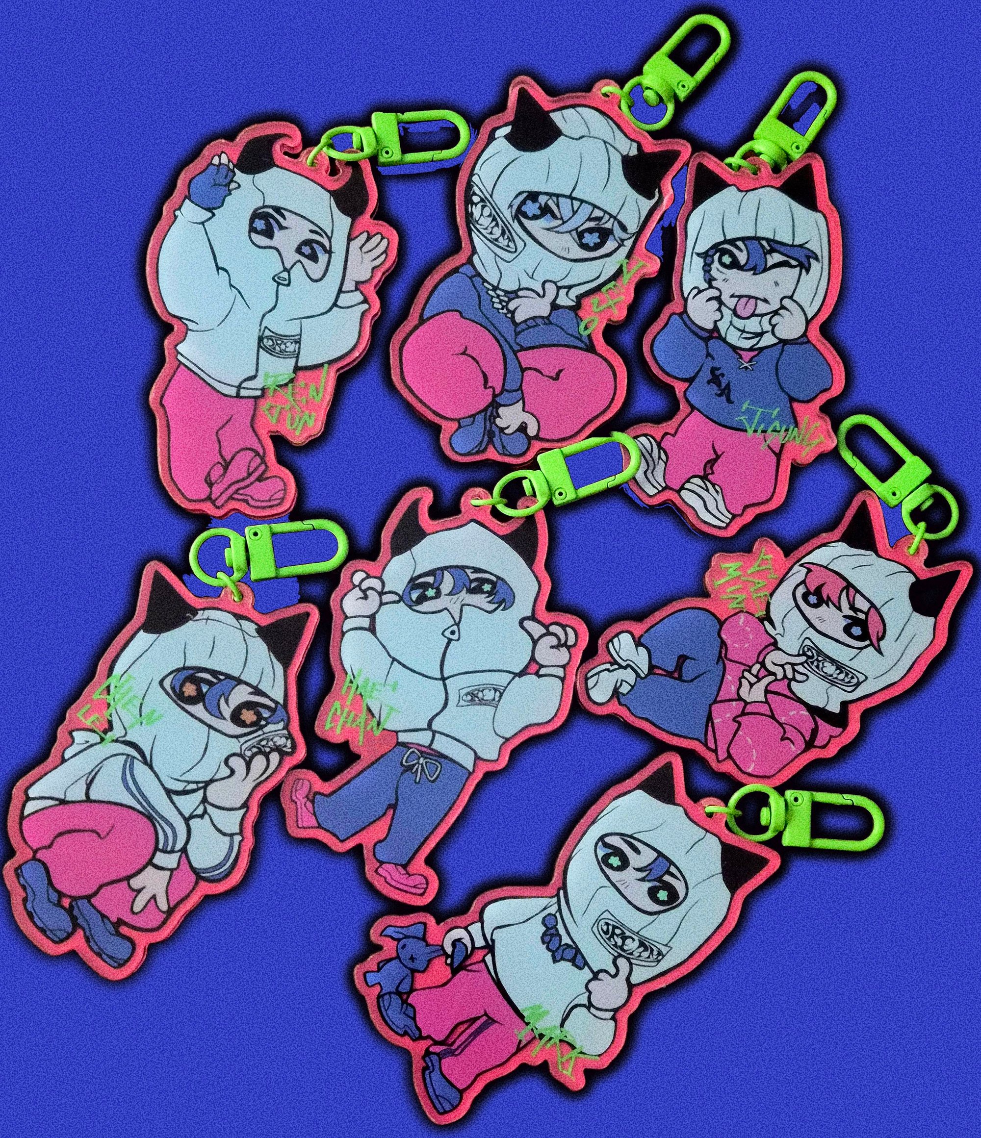 printed on acrylic with pink colored edges, neo green clasp front and back designs
